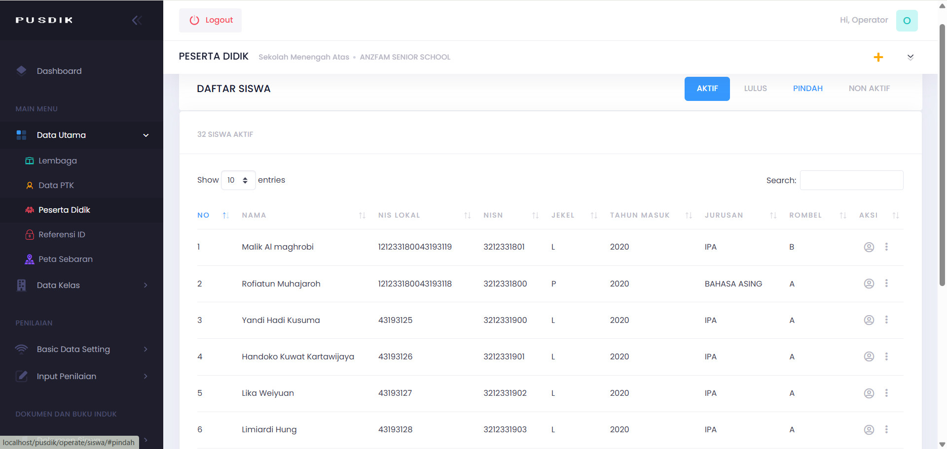 • Halaman Admin Jenjang : Mempunyai fungsi sebagai penginput Data Siswa, Data Tendik, Penilaian dan Pencetakan Buku Induk Siswa, Menyimpan Dokumen Elektronik Siswa, Mengatur Halaman Siswa. PUSDIK bisa digunakan lebih dari satu jenjang.