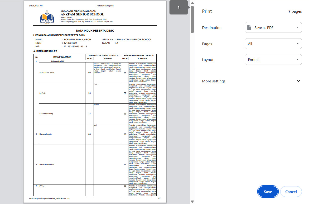Mencetak Induk (data diri dan nilai smstr)