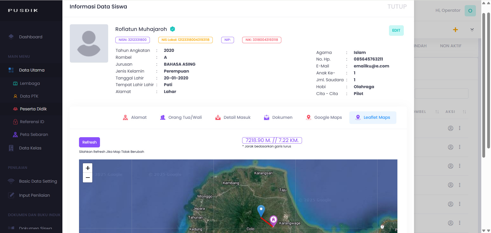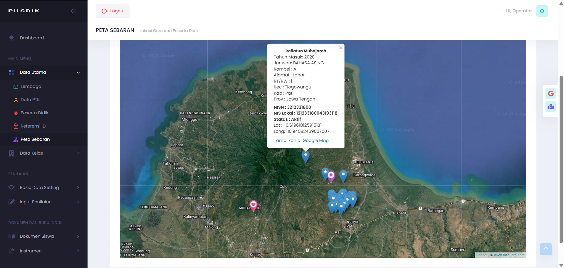 Dengan fitur ini kita bisa melihat lokasi kordinat tempat tinggal persiswa atau seluruh siswa melalui Map dengan memasukkan Latitude dan Longitude lokasi tenpat tinggal siswa.
